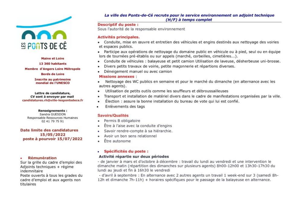Accueil » la mairie » Offres d’emploi » Emplois municipaux » Annonce – Adjoint technique – service environnement