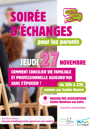 |Les rendez-vous des familles - soirées d'échanges|Dans le cadre du projet social de territoire, les villes des Ponts-de-Cé et de Sainte-Gemmes-sur-Loire s’associent pour proposer une soirée aux parents des deux communes.La thématique de la soirée a été proposée par des parents qui se questionnent sur l’organisation familiale : comment concilier vie de famille et vie