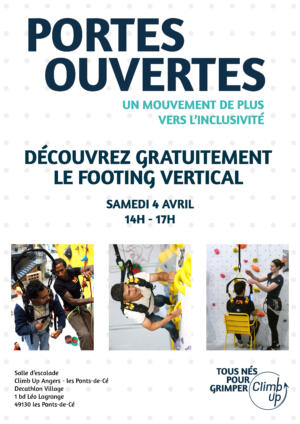 Rendez-vous le Samedi 4 Avril à Climb Up Angers pour découvrir le Footing Vertical.L’escalade assistée en accès libre - La solution innovante et inclusiveAfin de rendre notre salle accessible à tous, 7j/7, nous installons un enrouleur motorisé avec assistance à la montée.Accessible après une initiation avec nos moniteurs, ce dispositif vous permettra de grimper sur