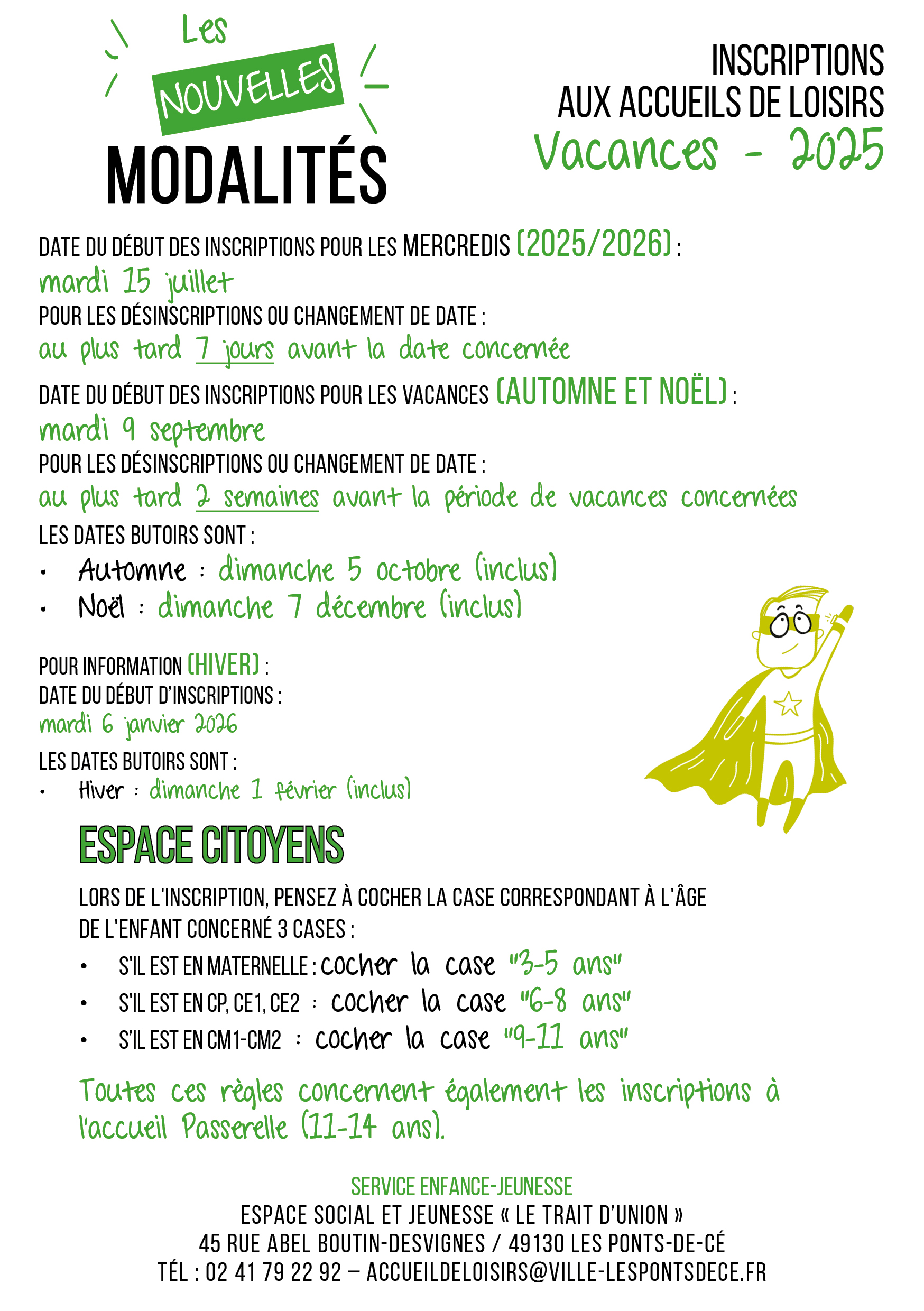 Inscription sur l’espace citoyens / vos démarches en ligne : accueils de loisirs : inscriptions aux accueils de loisirs du mercredi* https://www.espace-citoyens.net/ville-lespontsdece/espace-citoyens/Demande/NouvelleDemande/ALSH/ALSHMER